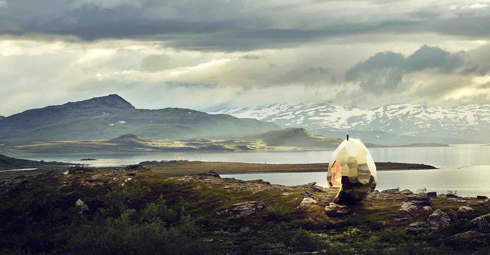 Mitt i den hisnande fjällnaturen har två konstnärer placerat Sveriges förmodligen mest spektakulära bastu – ett ägg i guld som på utsidan speglar sin storslagna omgivning och på insidan har värmande platser för åtta personer.