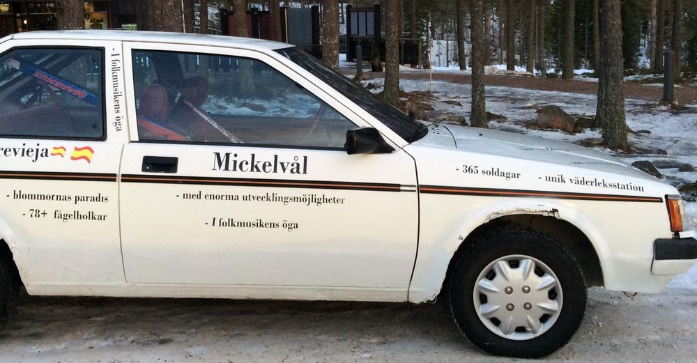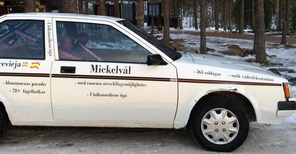 Själv kör han omkring i en bil full med dekaler med "mer eller mindre sanna" påståenden om Mickelvål, berättar Leif. Bland annat "solrosornas paradis", "känd från tidningar & tv", "med anor från 1500-talet" och "tiomilautsikt".