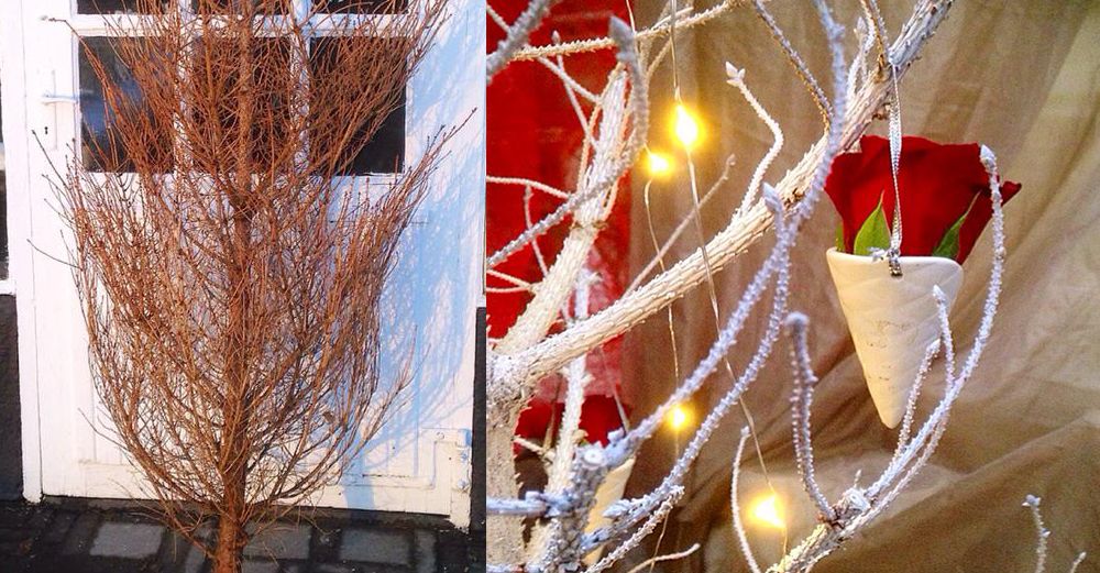 När julen var slut och alla barr fallit av - såg granen ändå snygg ut med sitt täta grenverk. Hon fick den lite galna idén att spara den i ett uthus till nästa år. Och försökte hon måla den med silverspray.
