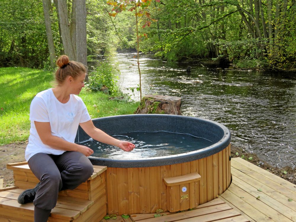 Solen glittrar i vattenytan på Holjeåns som brusar fram precis intill Martinas nyligen invigda Lev & Njut Spa.