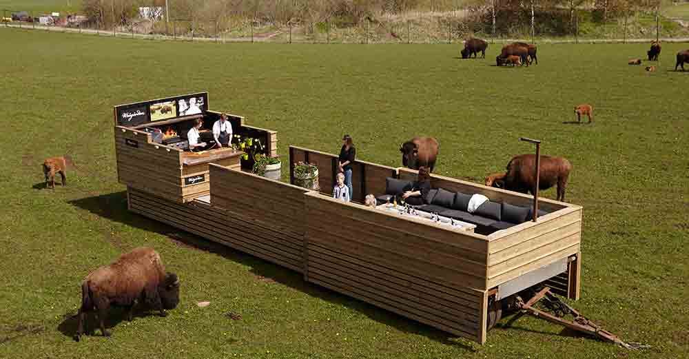 Nu kan du sova bland älgar och uppleva bisonoxar på nära håll – utanför Falköping! På Wrågården går det att sova över i älgstugan som står i älghänget och middagen lagas och serveras mitt i bisonparken.