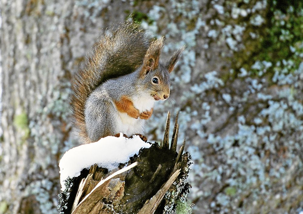 Ekorren är igång hela vintern och äter frön från gran- och tallkottar. Den gömmer nötter och ekollon i marken och om du undrar över svampar inklämda i grenklykor, så är det ekorren som sparat för att äta senare.