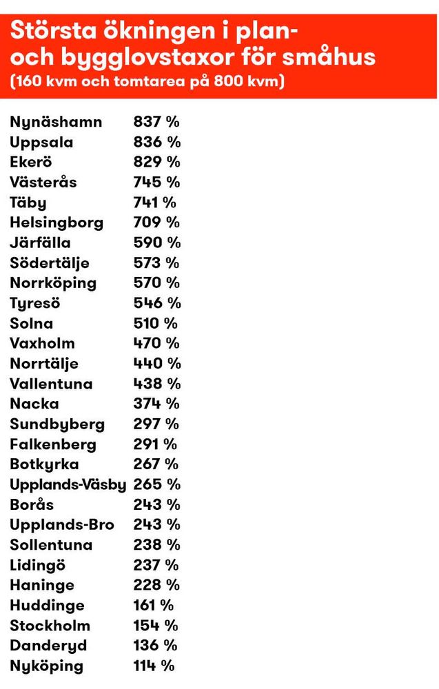 Nu blir det mycket siffror, men det är värt att försöka hänga med. En rapport från Kungliga Tekniska Högskolan (KTH) visar att plan- och bygglovstaxorna i genomsnitt mer än fyrdubblats under perioden 1990-2015. Av de 28 undersökta kommunerna ligger Nynäshamn i topp när det gäller ökning. I denna skärgårdskommun har plan- och bygglovstaxan ökat med, håll i er nu, 837 procent! Och skillnaderna är stora mellan kommunerna.