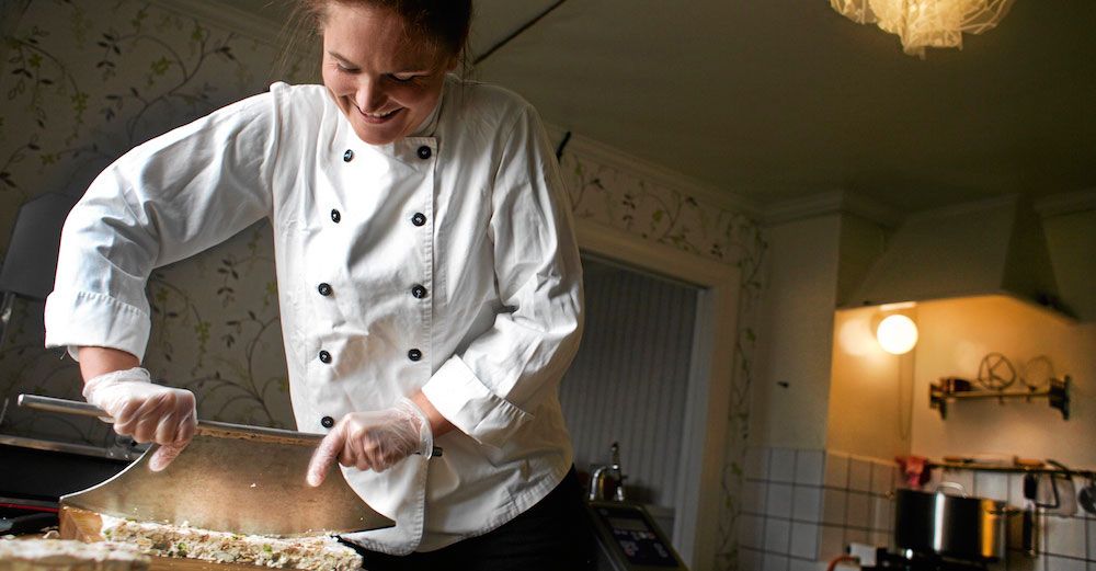 Förra året tog hon steget. Inredde ett litet tillverkningskök, köpte en stor kopparkittel speciellt lämpad för karamellkok, en specialtillverkad yxliknande kniv för att skära nougaten och en bandsåg (!) i fall det blir för tungt att skära för hand.
