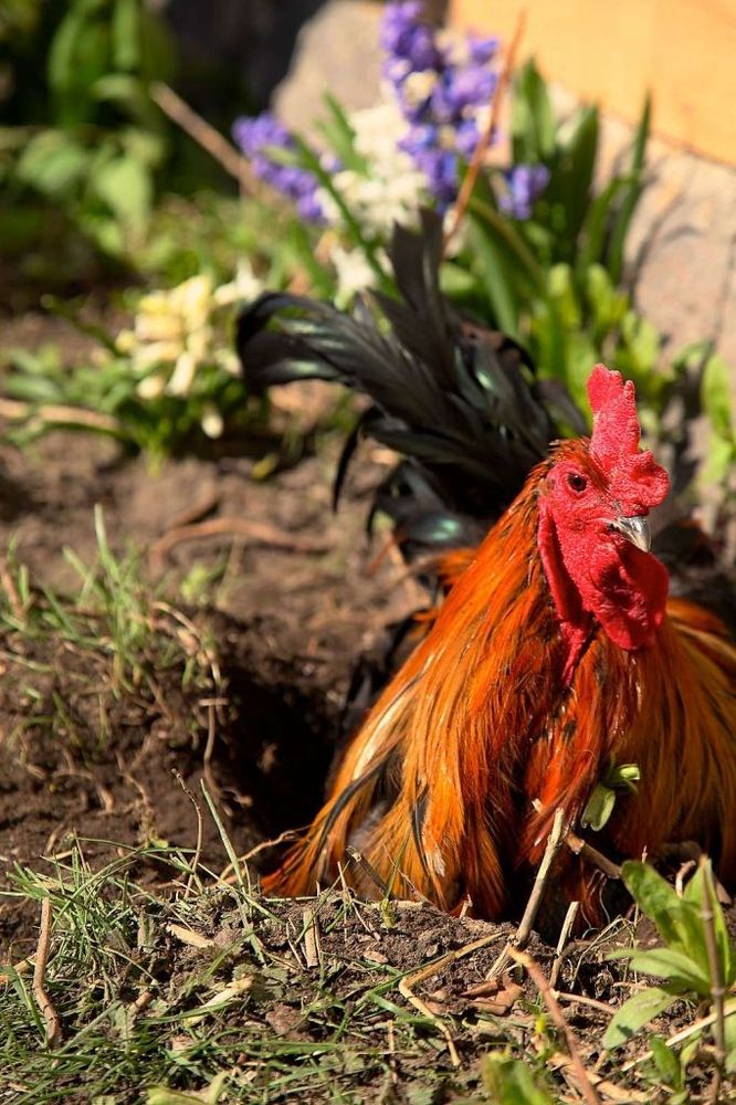 Doris, som är ledarhönan, försöker nappa åt sig en bit av den guldgula sockerkakan, men hon får nöja sig med mask som hon hittar i gräsmattan. Kycklingarna har gått till sin mamma som lär dem att hitta mat och akta sig för rovfåglar. Medan vi dricker kaffe sandbadar både tuppar och hönor i den varma vårsolen intill husväggen.