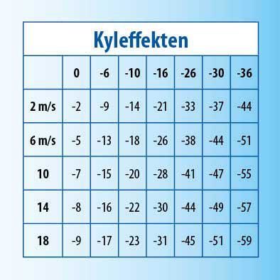 Översta vågräta raden visar temperaturen, från 0 till minus 36 grader. Den lodräta raden längst till vänster visar vindstyrkan i meter per sekund.
