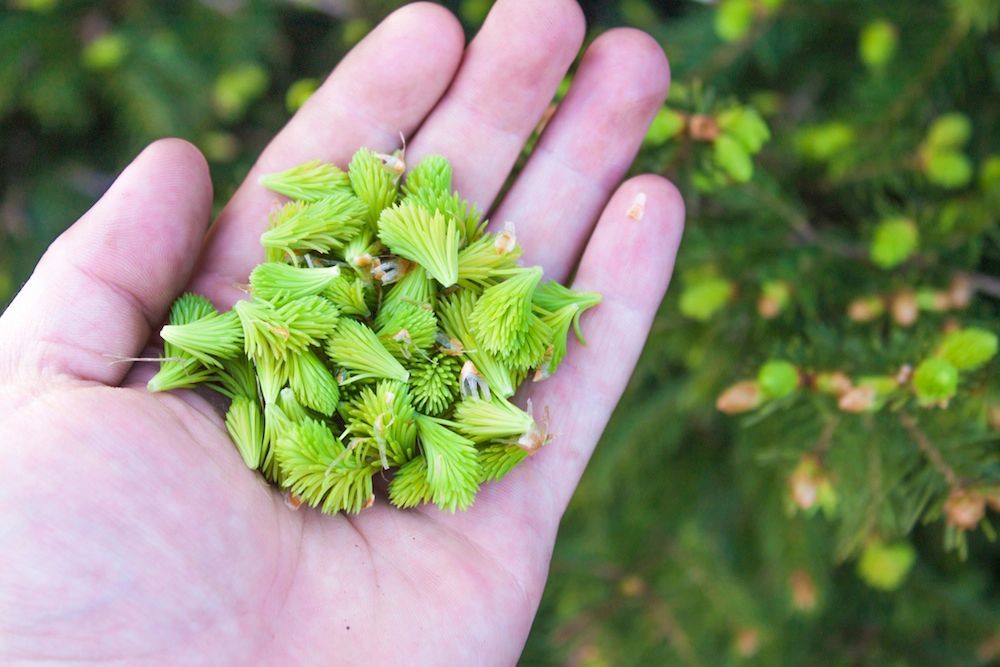 Nyp av och stoppa direkt i munnen. De nya, mjuka granskotten är som gröna snacks. Lite sötma och syra, som harsyra ungefär, och så lite kryddig friskhet på det.