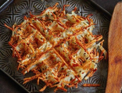 Stek potatisrösti i våffeljärnet, enkelt, gott och krispigt! Glöm inte att krama ur den rivna potatisen lite i en ren handduk innan du steker den i välsmort järn.
