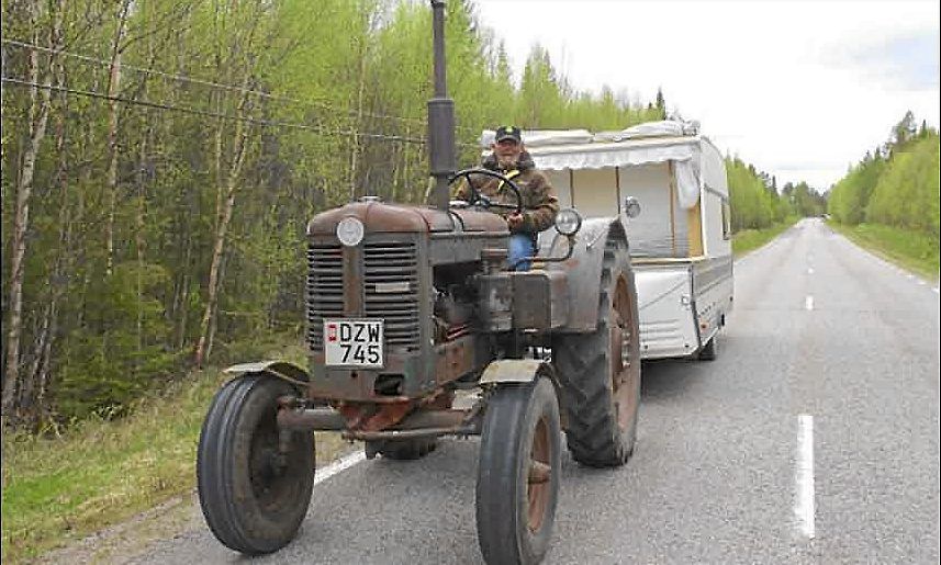 Traktorn är en BM 36 från 1954 och den går inte fortare än 20 km i timmen. Men Åke Larsson har ingen tid att passa och dessutom har han husvagnen på släp med det mesta han behöver.