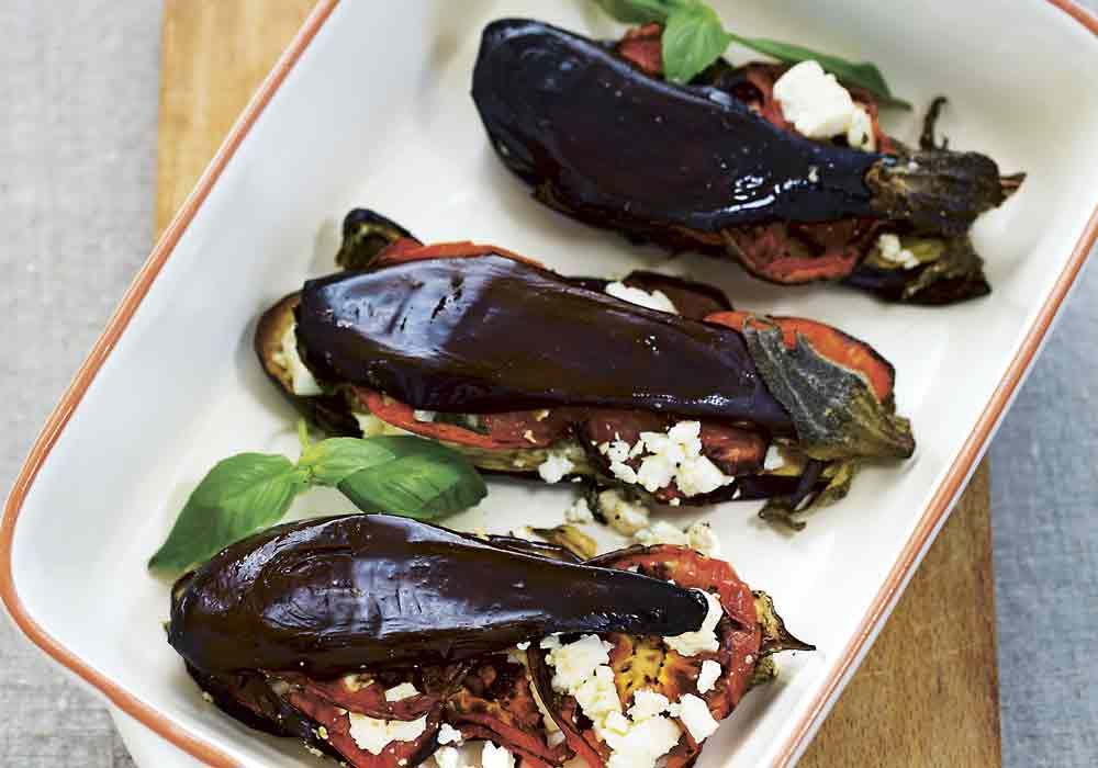 4. Ta ut plåten ur ugnen. Placera tomatskivor ovanpå varje aubergineskiva. Strö över salt, peppar och basilikablad. Ställ tillbaka i ugnen och höj värmen till 250 grader. Låt baka i cirka 10 minuter.