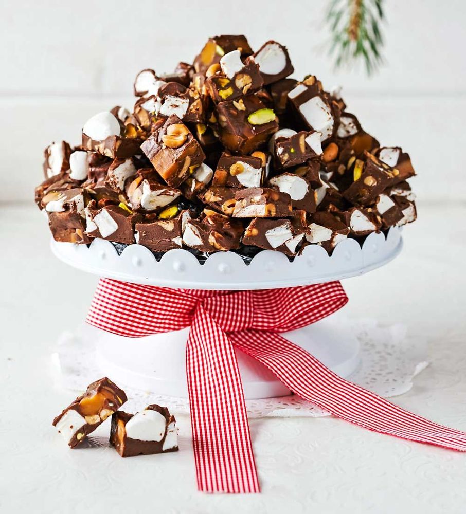 En ljuvlig, mjuk chokladblandning med salta jordnötter, kola och fluffiga marshmallows.