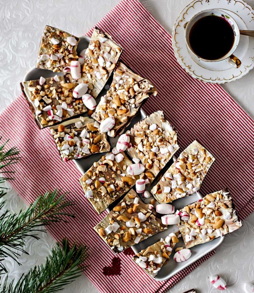 3. Strö polkagris och cashewnötter över den vita chokladen innan den stelnar. Låt chokladen stelna i en stund i kylskåpet. Bryt bitar från chokladbräcket.
