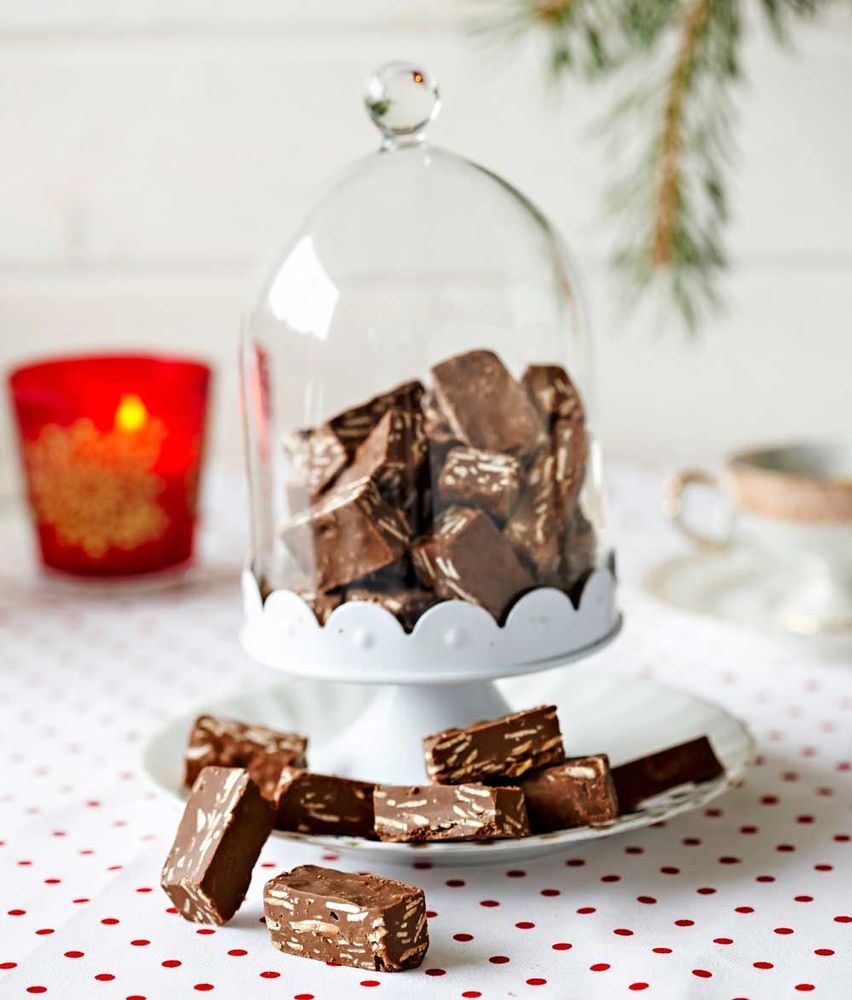 4. Skär chokladen i lagom stora bitar med en vass kniv. Förvara godiset i en burk med tättslutande lock i kylskåpet.