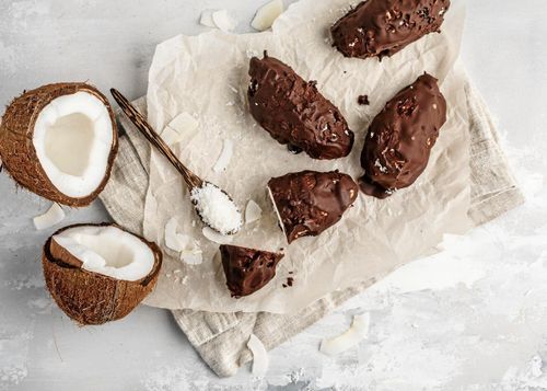 Minibars fyllda av dadlar och kokosflingor, doppade i härligt mörk choklad.