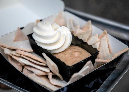 Roy Fares nachosemla är triangelformade vete- och kardemummachips som doppas i vispad grädde och mandelmassa.