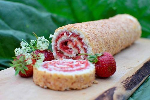Kokos, rabarber och jordgubbar. Underbara smaker i en riktigt härlig rulltårta som är bakad av Landläsaren Ellen Hörnell. Här bjuder hon på receptet.