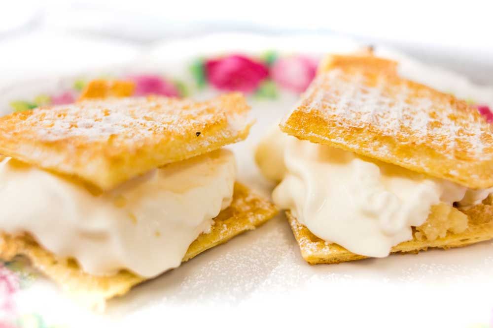 Bred en klick av mandelmixen över en bit nygräddad våffla. Toppa med vaniljgrädde, lägg på en bit våffla till som lock och ”damma” över florsocker.