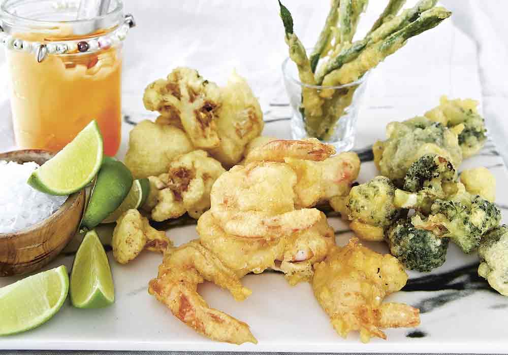 1. Tempurafriterade grönsaker och scampi med het majo