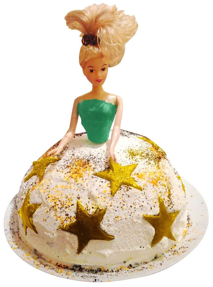 Klä in en plastbunke med plastfolie. Skopa upp massor av glass och täck kanterna, så att du bildar en skål av glassen. Varva med smulade maränger, vaniljglass och häll i chokladsås. Se till att du gör avslutningen platt. Ställ in i frysen tills glassen stelnat. Vänd upp och ner på bunken på ett fat och skaka försiktigt ut klumpen av glass och ta bort platsfolien. Täck hela glassbomben med grädde och dekorera med strössel eller figurer av sockerpasta. Tryck ner en halv docka eller köp en specialgjord tårtdocka. Här har vi klätt dockan med sockerpasta. Klart!