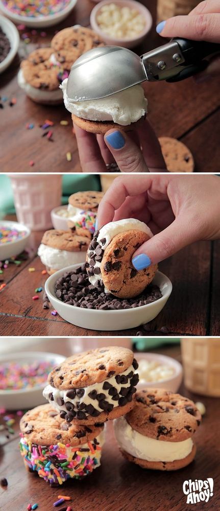 Köp dina favoritkakor eller baka egna. Skopa upp en glassklick på ena kakan och tryck ihop med en annan kaka. Rulla kakan i valfri topping. Bildkälla