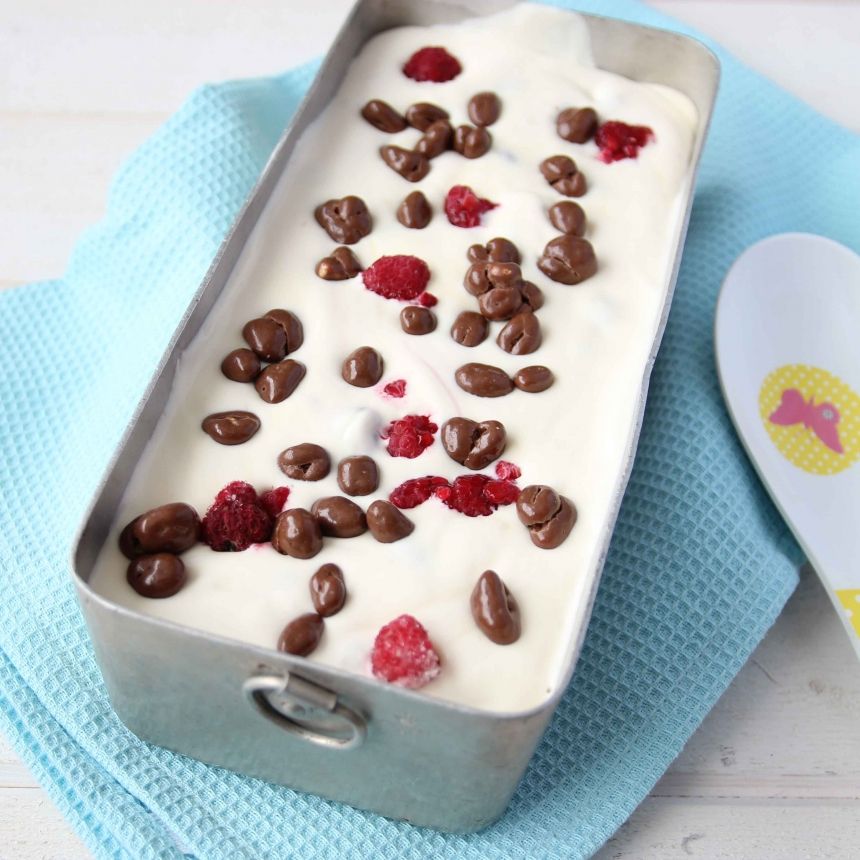 Fantastiskt krämig och lättgjord glass med hallon och frasiga chokladpuffar.