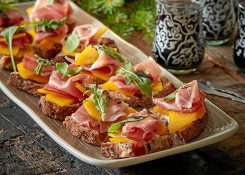 Lyxigt goda små snittar med lufttorkad skinka och saffranskokta päron smakar fantastiskt gott till glöggen.