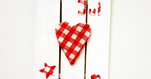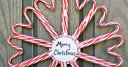 En pappskiva, lite tejp och massor med polkagriskäppar blir en hjärtlig julkrans.