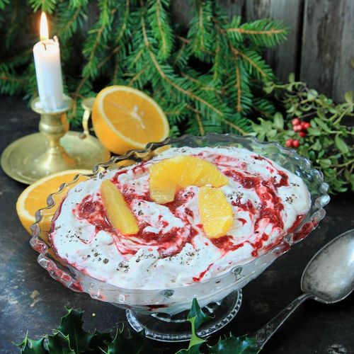 Vår mest klassiska juldessert blir extra god med en kardemummasmakande hallonsås.
