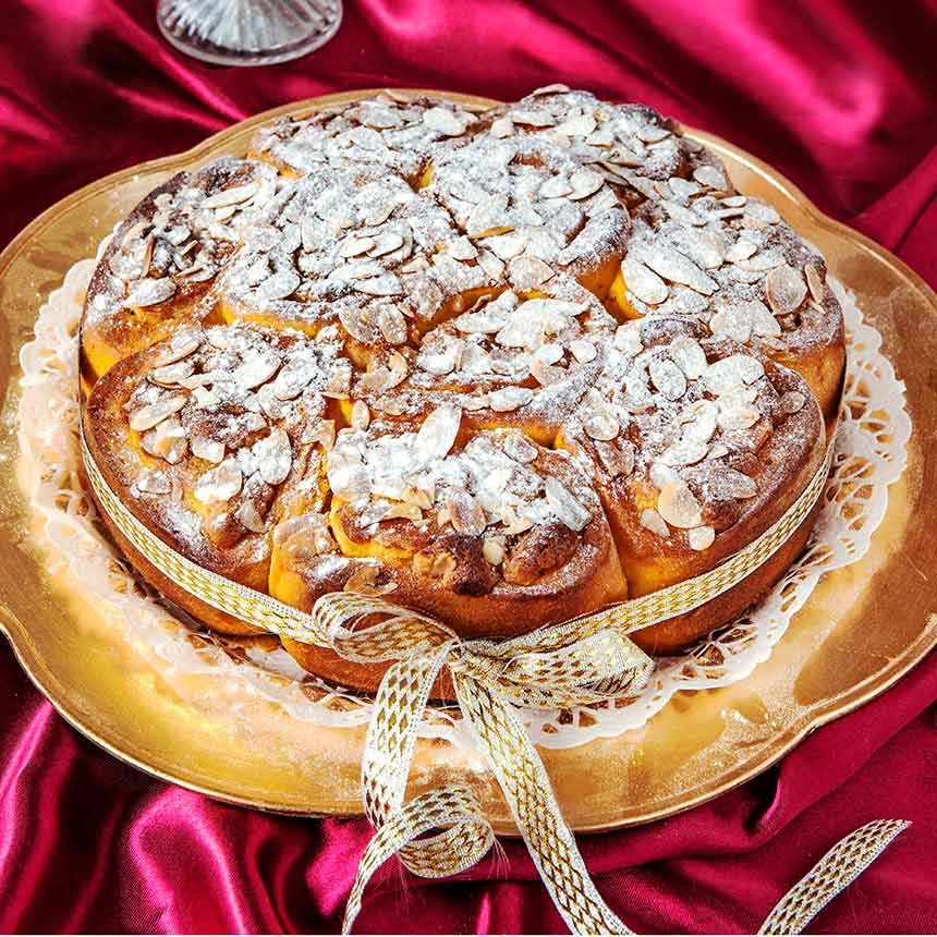 Guldgul saffransbutterkaka med apelsinsmak som blir extra saftig med fyllningen av mandelmassa. Här är receptet.
