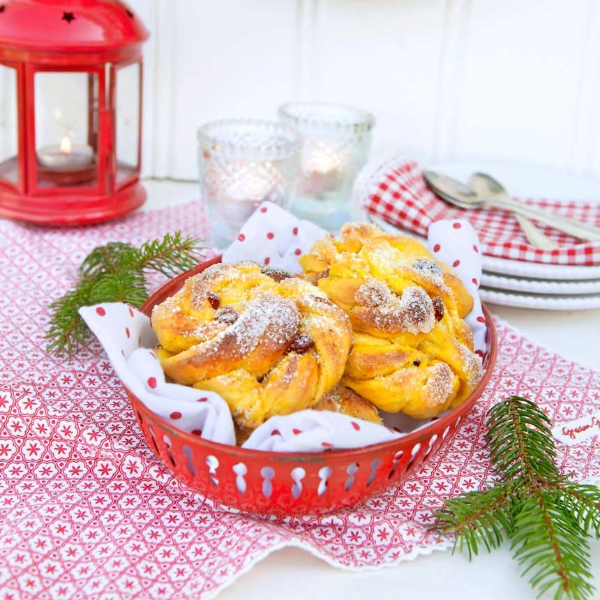 De här saffransdoftande bullsnurrorna blir härligt sötsyrliga med tranbär. Här är receptet.