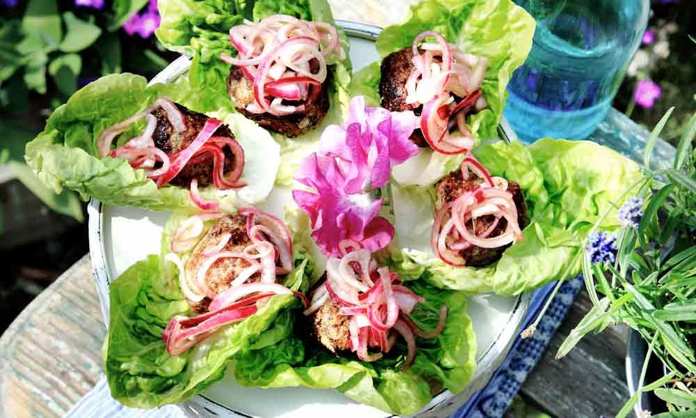 6. Vid servering: Värm eventuellt köttbullarna. Lägg dem i salladsblad och toppa med lite picklad rödlök.