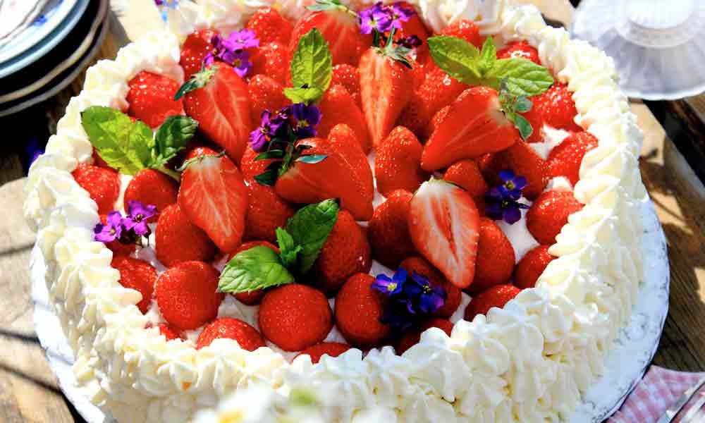 5. Bred vispad grädde runt tårtan. Garnera med spritsad grädde och jordgubbar.