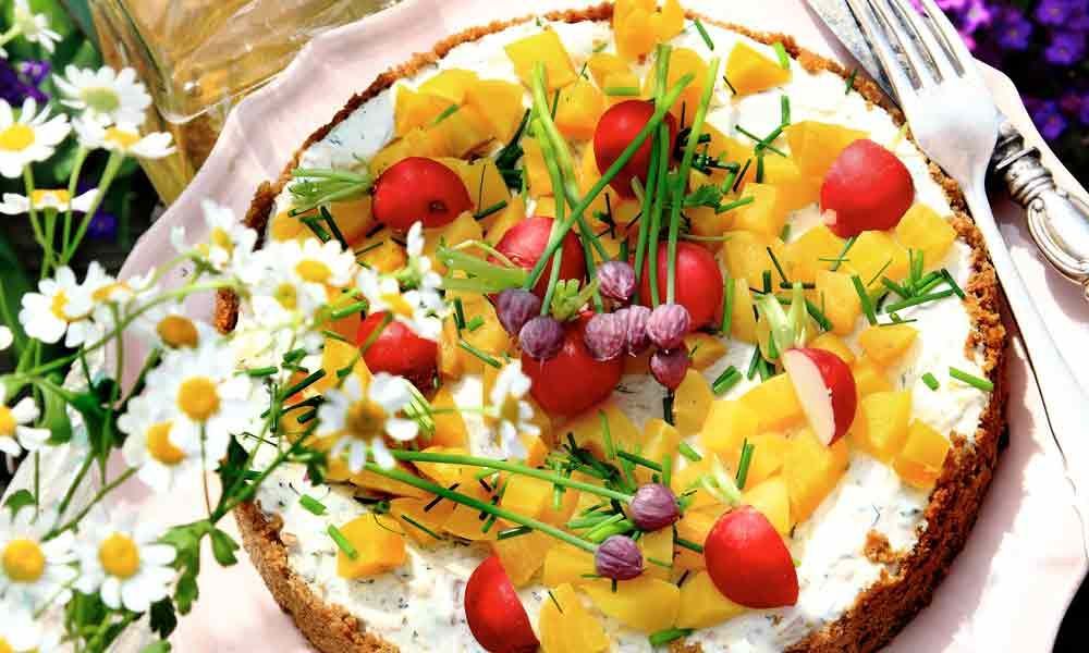 6. Bred ut fyllningen över bottnen. Täck över och låt stelna i kylen i minst 4 timmar. Garnera med gulbeta, rädisor, gurka och gräslök vid servering.