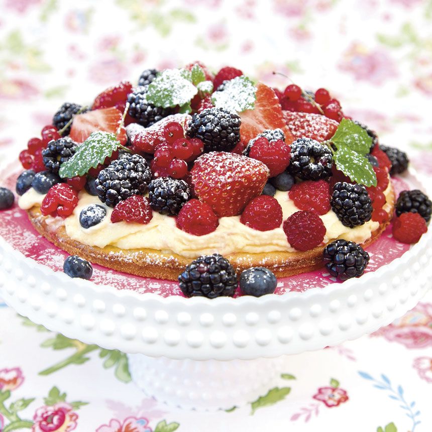 På en botten av mandelmassa lägger du sommarens alla goda bär: hallon, blåbär, björnbär, vinbär och jordgubbar. Receptet finns här.