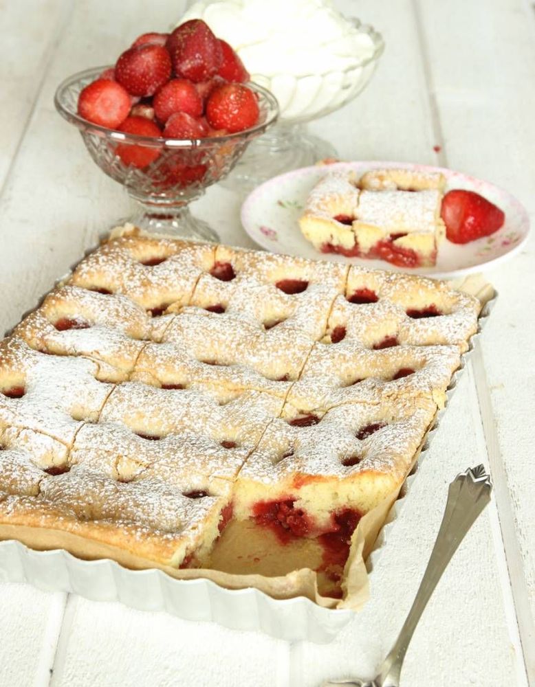 Ljuvligt god och enkel jordgubbskaka som passar perfekt som dessert eller till kaffet. Enkel att göra och blir snabbt en favorit. OBS: Man kan byta ut jordgubbarna mot krusbär ... Receptet hittar du här.