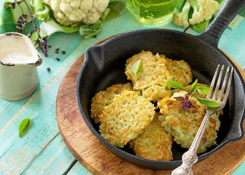 Variera middagen eller lunchlådan med vegetariska blomkålsbiffar och yoghurtsås.
