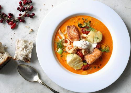 En värmande fisksoppa med saffran, räkor, torskrygg och laxfilé att servera i vintermörkret.