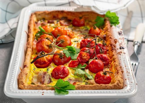 Gör en god och matig paj med bacon och paprika att servera till många eller dela upp och frysa in.