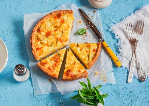 En vegetarisk paj med äggstanning och grönsaker efter eget tycke och säsong.