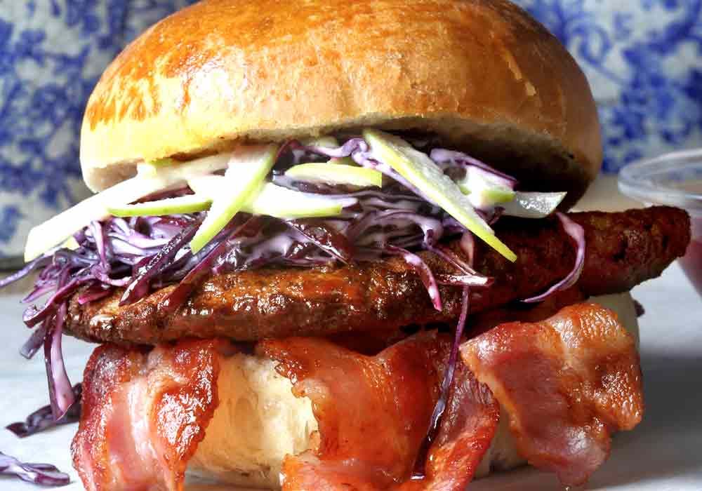 5. Gör burgare med bacon, viltfärs, lingonketchup och coleslaw mellan bröden.