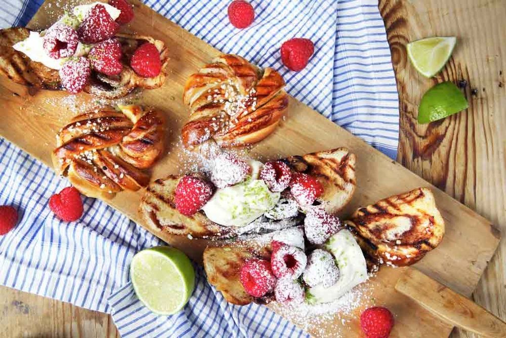 3. Grilla bullskivorna hastigt på båda sidor. De ska bli varma och lite frasiga. Servera direkt tillsammans med en klick av mascarponen och hallonen. Pudra gärna lite florsocker över. Njut!