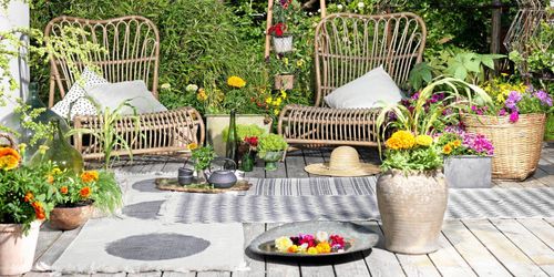 Vänta med utemöblerna. Fyll krukor, korgar, baljor och byttor med växter först. När blommorna hittat sin plats är sommarkänslan räddad.