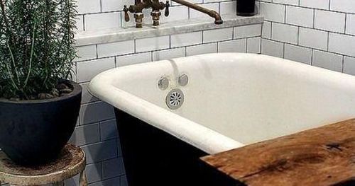 Skapa en omedelbar spakänsla i badrummet genom att lägga en gärna sliten gammal planka som hylla över badkaret. Snyggt, snabbt och praktiskt!