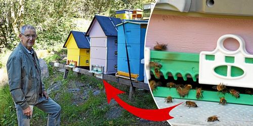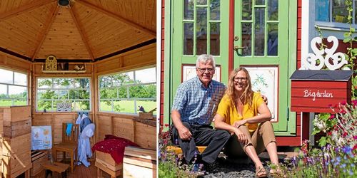Sexkantig som en vaxcell, med plats för fem kupor och dekorerad med snickarglädje, dekorationsmålningar och spira. Liselott Åkesons bipaviljong är lika vacker som praktisk.