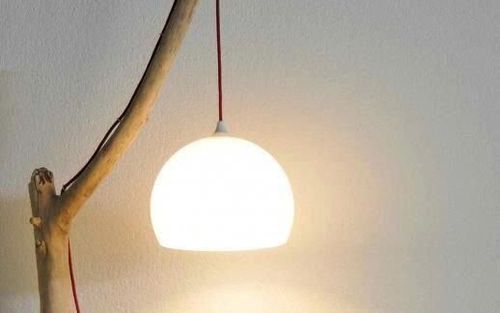 Drivved och en ren, enkel lampa med röd sladd blir en snygg kontrast.