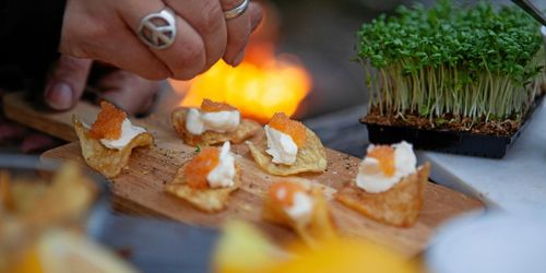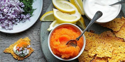 Lantchips med klickar av crème fraiche och löjrom är lyxigt gott till glöggen.