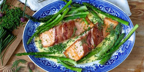 En perfekt rätt där laxen får goda smaker från bacon. Hollandaise därtill blir en magisk mix!