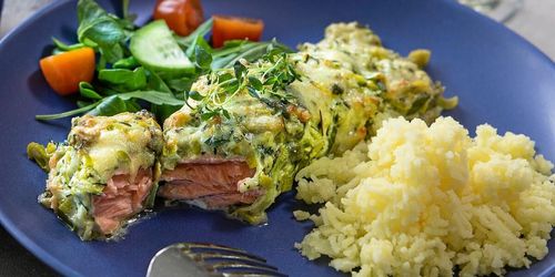 Saftig helstekt lax med smakrikt täcke av Västerbottensost