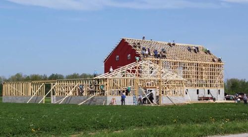 Är man tillräckligt många kan man bygga en lada på tio timmar. De gjorde lantbrukarna i Amish-byn La Rue i Ohio i USA. Dessutom filmade de allt.