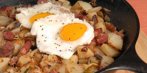 En klassisk pyttipanna består av två till tre sorters kött, stekt potatis och gul lök